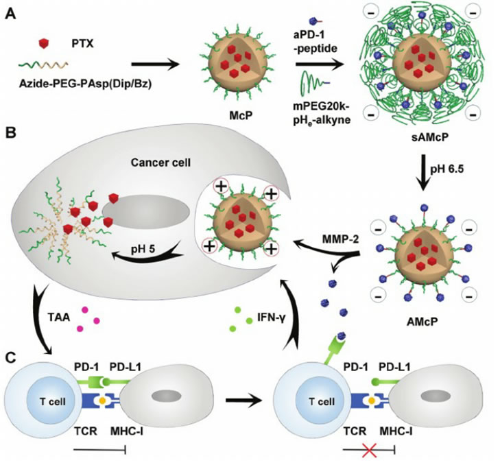 为提高抗肿瘤效果,材料科学与工程学院帅心涛教授团队开发了一种可共输送免疫检查点抗PD-1抗体和化疗药物紫杉醇用于协同的肿瘤化学免疫治疗的纳米药物。如图2所示,嵌段共聚物叠氮-聚乙二醇-聚天冬氨酸(N,N’-二异丙基乙二胺/苄胺)(Azide-PEG-PAsp(Dip/Bz)) 通过自组织形成pH响应的胶束结构,其内核通过π–π堆叠作用包载了化疗药物紫杉醇。然后,通过叠氮-炔基点击反应将MMP-2酶敏感肽偶联的PD-1抗体和含酸敏感键修饰到胶束表面。PEG的“隐蔽”作用使该sAMcP纳米胶束具有长循环性质,可以共输送PD-1抗体和紫杉醇并被动聚集于肿瘤组织。进一步地,在肿瘤微环境的弱酸性(pH6.5)和高表达的MMP-2酶条件下,PEG20K和PD-1抗体触发释放。同时,由于负电荷抗体的脱落及Dip基团的部分质子化,胶束的表面电位由负变正,变得更容易被肿瘤细胞摄取。最后,pH敏感的胶束核响应于溶酶体的酸性快速释放紫杉醇。体内及体外的实验研究表明,该纳米药物共输送紫杉醇和PD-1抗体可联合化疗和免疫治疗,实现协同的抗肿瘤效果。