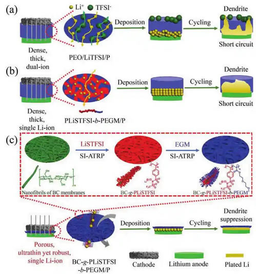 最近,中山大学吴丁财教授课题组受软硬试管刷的启发,设计合成了一种具有硬纳米纤维骨架和软功能聚合物侧链的新型超结构聚合物分子刷BC-g-PLiSTFSI-b-PEGM,并进一步引入增塑剂,得到单锂离子导体准固态聚合物刷电解质(SLIC-QSPBEs)。对于所制备的 SLIC-QSPBEs,细菌纤维素(BC)纳米纤维骨架提供了强劲的机械性能,并形成了高度多孔的三维纳米网络结构,具有丰富可移动锂离子的聚(4-苯乙烯磺酰-三氟甲基磺酰亚胺)(PLiSTFSI)保证了单一的锂离子传导行为,聚二甘醇单甲基醚甲基丙烯酸酯(PEGM)提供了锂离子传输基质。所制备的SLIC-QSPBEs兼具超薄(10 μm)和优异的机械性能(杨氏模量 = 1.9 GPa)。得益于上述独特的纳米拓扑结构和多功能组分的协同效应,SLIC-QSPBEs可以有效地消除浓差极化,提高机械性能,增强离子传输以及降低界面阻抗。基于超薄而坚固的SLIC-QSPBEs组装Li|Li对称电池,在电流密度为1 mA cm-2时,可逆实现稳定的镀锂/剥锂超过3300 h以上。这项工作为开发新型固态锂金属电池电解质提供了一种很有前景的策略。