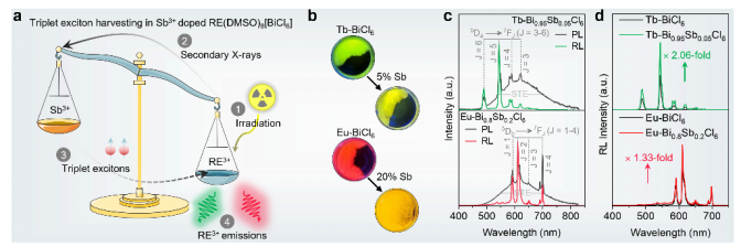 近日,王静教授团队在稀土基金属卤化物闪烁体单晶研究方面取得重要突破。研究团队提出了一种锑辅助三重态激子捕获策略,成功设计合成了高效稀土基杂化金属卤化物单晶闪烁体RE(DMSO)8[Bi1-xSbxCl6] (RE = Tb, Eu)。在X射线激发下,除了直接激发稀土离子外,由[SbCl6]3-产生的三重态激子还能通过能量转移进一步敏化稀土离子,构建了双通道激发途径,显著增强了稀土离子的辐射发光(图1)。