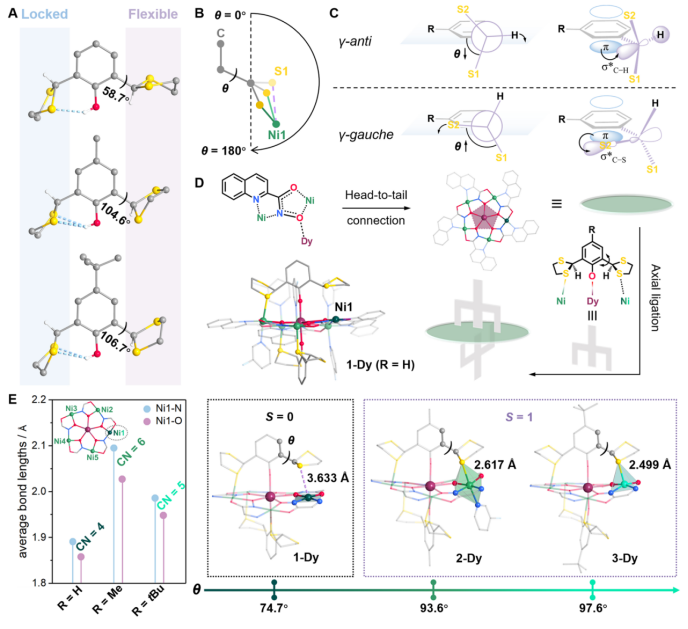 1(A, B & C轴向配体的结构示意图以及其σ键旋转的构象分析;(D{Ln[15-MCNi-5](HDDTP)}的合成示意图;(E)金属冠醚磁体的Ni1NNi1O的平均键长以及取代基诱导的扭转角和Ni1S距离变化。