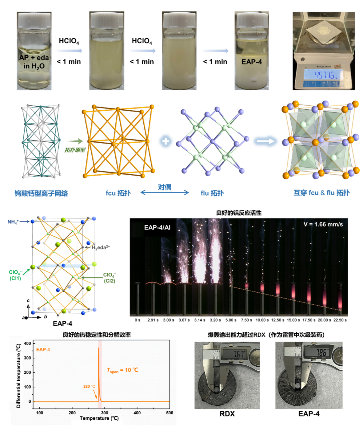 近日,该团队提出“对偶拓扑”策略,设计了一例新型多离子集成含能材料(H2eda)2(NH4)(ClO4)5(EAP-4, H2eda2+为乙二铵),其钨酸钙型子晶格(由占据特殊位置的NH4+和ClO4−组成)与对偶萤石型子晶格(由H2eda2+和剩余ClO4−组成)相互穿插,形成致密的非钙钛矿型结构(空间群I41/a)。这一独特的结构特征使EAP-4兼具高晶体密度(1.912 g·cm−3)、高合成效率(10分钟内实现超过70%的产率)、高热稳定性(起始分解温度280℃)以及少见的正氧平衡(+6.3%)。这种创新设计使EAP-4不仅继承了多离子集成含能材料原料成熟、合成工艺简捷、易规模化制备等优点,还成为一种独特的双功能材料:(1)可作为猛炸药,其性能比肩现役主流军用炸药RDX(经铅板实验验证);(2)可作为固体氧化剂,其热分解效率和铝反应活性均显著超过标杆氧化剂高氯酸铵。这个“对偶拓扑”新策略不仅为多离子集成含能材料的设计提供了非钙钛矿型新结构模型,还有望促进致密多离子杂化材料的系统开发。